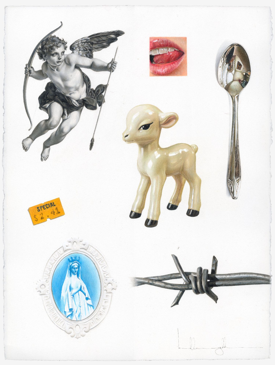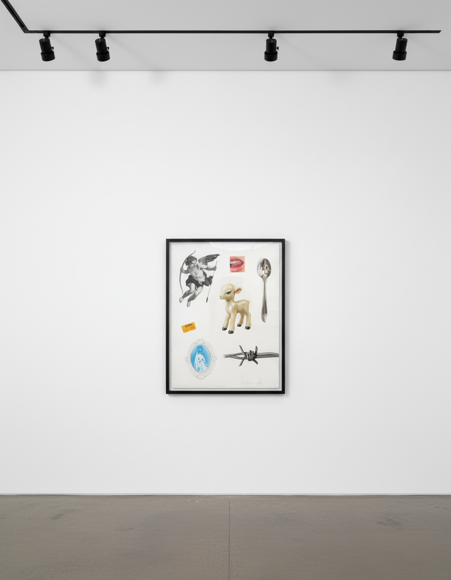 In Flash Sheet, Bella McGoldrick assembles a constellation of meticulously rendered symbols—each charged with its own cultural and emotional resonance. A cherub, a barbed wire twist, a porcelain lamb, a bitten lip, and a shimmering spoon coexist within a single, immaculate composition. Referencing the language of tattoo “flash” designs, McGoldrick treats these icons like emblems of memory and identity, blending innocence with provocation, devotion with desire. Her hyperrealist precision turns each object into a relic of contemporary mythology—objects at once sacred, kitsch, and deeply human.