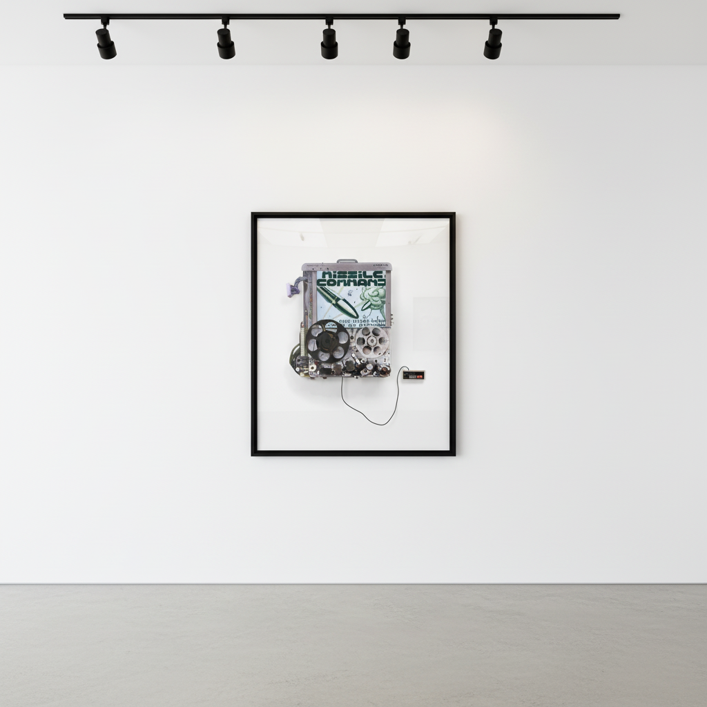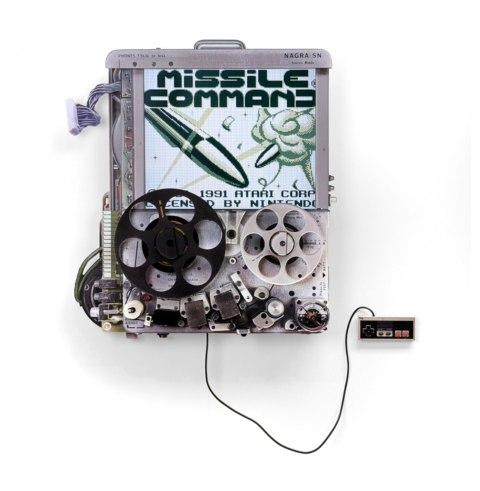 Aluminum composite panelling,19” IPS screen, Raspberry Pi, GameBoy emulator, Missle Command ROM, NES controller, 2 DC motors with control switch (tape reels rotate)