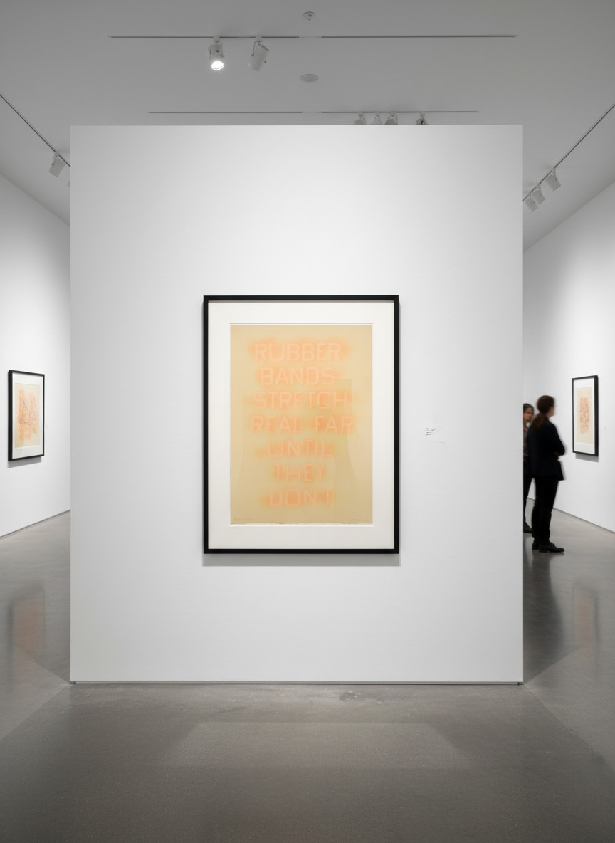 Ed Ruscha’s text works have long existed in the space between reading and looking, and the selection presented here captures that tension with particular clarity. In works such as History Kids, Wall Rocket, Sponge Puddle, and Mysteries, language does not explain the image but hovers within it, flattening hierarchy between word and landscape. The mountainous backdrops and atmospheric skies function less as literal places than as emotional fields, allowing the text to feel suspended, uncertain, and quietly loaded. Pieces like Liberty and Begin Anywhere extend this ambiguity into cultural and psychological territory, using familiar words that resist fixed meaning and instead invite personal interpretation. The Rubber Bands states push this further, where repetition and subtle shifts in color transform a simple phrase into an exploration of endurance, erosion, and time. Across these works, Ruscha treats language as material rather than message, stripping it of urgency or instruction and replacing it with mood, restraint, and duration. Together, this group reflects a mature distillation of his practice, where words become landscapes to live with, not statements to resolve.
