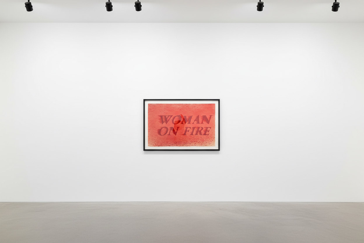 Ed Ruscha’s Woman on Fire is a striking example of the artist’s ability to distill narrative, emotion, and atmosphere into the simplest combination of text and color. Presented in a fiery spectrum of reds, the phrase “WOMAN ON FIRE” appears as if it has been scorched or burned into the surface, the letters radiating heat and urgency. Ruscha’s characteristic restraint—clean typography, centered composition, and a subtly textured background—creates a powerful tension between minimal form and explosive meaning. The work’s drama lies not in what is depicted, but in what is suggested: transformation, danger, passion, rebellion, or even empowerment. As with many of Ruscha’s text works, Woman on Fire operates like a fragment of a larger story, a cinematic still from an unseen film. The ambiguity of the phrase invites multiple interpretations, allowing viewers to inhabit the emotional terrain of the piece in deeply personal ways. Ruscha’s genius lies in his ability to turn language into atmosphere, and here he channels the heat of the American psyche—its desire, volatility, and mythmaking—into a deceptively simple, unforgettable image.