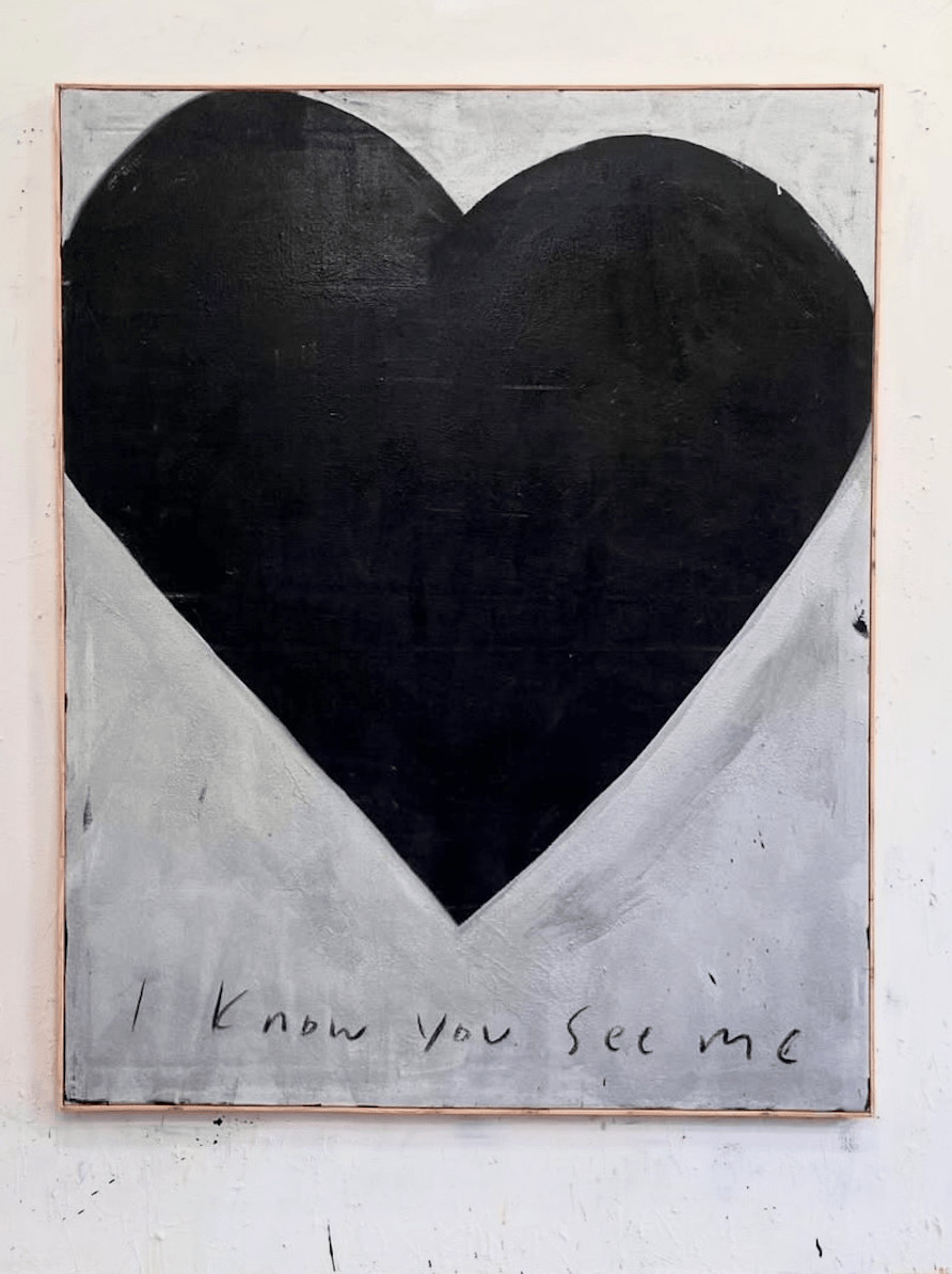 Eric Stefanski's "I Know You See Me" presents the titular phrase rendered in his characteristic approach to text as both image and emotional artifact. The words occupy the canvas with an assertive presence, their letterforms built through layered applications of oil paint that reveal the physical history of their making. Stefanski's brushwork carries visible texture and variation, allowing the paint itself to communicate beyond the semantic content of the words. The scale of the work—sixty by forty-eight inches—transforms what might otherwise read as a whispered confession into something closer to a declaration, the phrase confronting viewers at a bodily level. The emotional register here operates in the charged space between vulnerability and confrontation. "I Know You See Me" functions simultaneously as an acknowledgment and an accusation, recognizing the viewer's gaze while refusing to be diminished by it. This duality is central to Stefanski's practice, where language becomes a site of accumulated feeling rather than mere information. The words carry what the artist describes as emotional residue—the weight of every context in which such a phrase might be spoken, the countless moments of being perceived, recognized, or exposed. Within Stefanski's broader body of work, this piece exemplifies his commitment to elevating everyday language into visual and emotional experience. The directness of his text-based paintings strips away representational distance, creating an immediate encounter between viewer and sentiment. There is no narrative buffer, only the phrase and its reverberations. For acquisition inquiries regarding "I Know You See Me," please contact Guy Hepner gallery in New York.