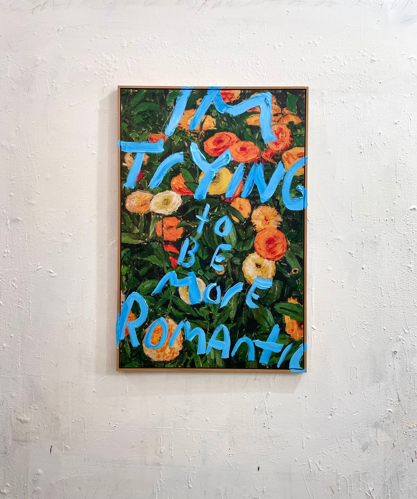 Eric Stefanski's "I'm Trying" presents the phrase as both confession and declaration, rendered in his characteristic hand-painted lettering against a printed surface. The work measures 35x24 inches, intimate enough to feel like a direct address, large enough to command attention from across the room. Stefanski's brushwork carries visible texture, each letter bearing the subtle irregularities of human effort—the slight variations in weight, the places where paint pools or thins. The oil medium marks a departure from his typical acrylic practice, lending the surface a luminosity and depth that feels appropriate for such a vulnerable statement. The emotional register operates in that uncomfortable space between exhaustion and perseverance. "I'm Trying" refuses the triumphalism of motivational language while also declining despair. It sits with the difficulty of effort itself, acknowledging that trying is sometimes all we have and that this might be enough, or might not be. Stefanski transforms what could be a throwaway phrase—something muttered in frustration or offered as apology—into something worthy of sustained attention. Within his broader practice, this work continues Stefanski's investigation of language as emotional residue. His text-based paintings treat words not as information but as feeling made visible, each piece functioning as a kind of verbal artifact pulled from the stream of contemporary experience. The simplicity is deceptive; these works ask us to slow down and sit with phrases we might otherwise let pass without notice. For acquisition inquiries, contact Guy Hepner gallery in New York.