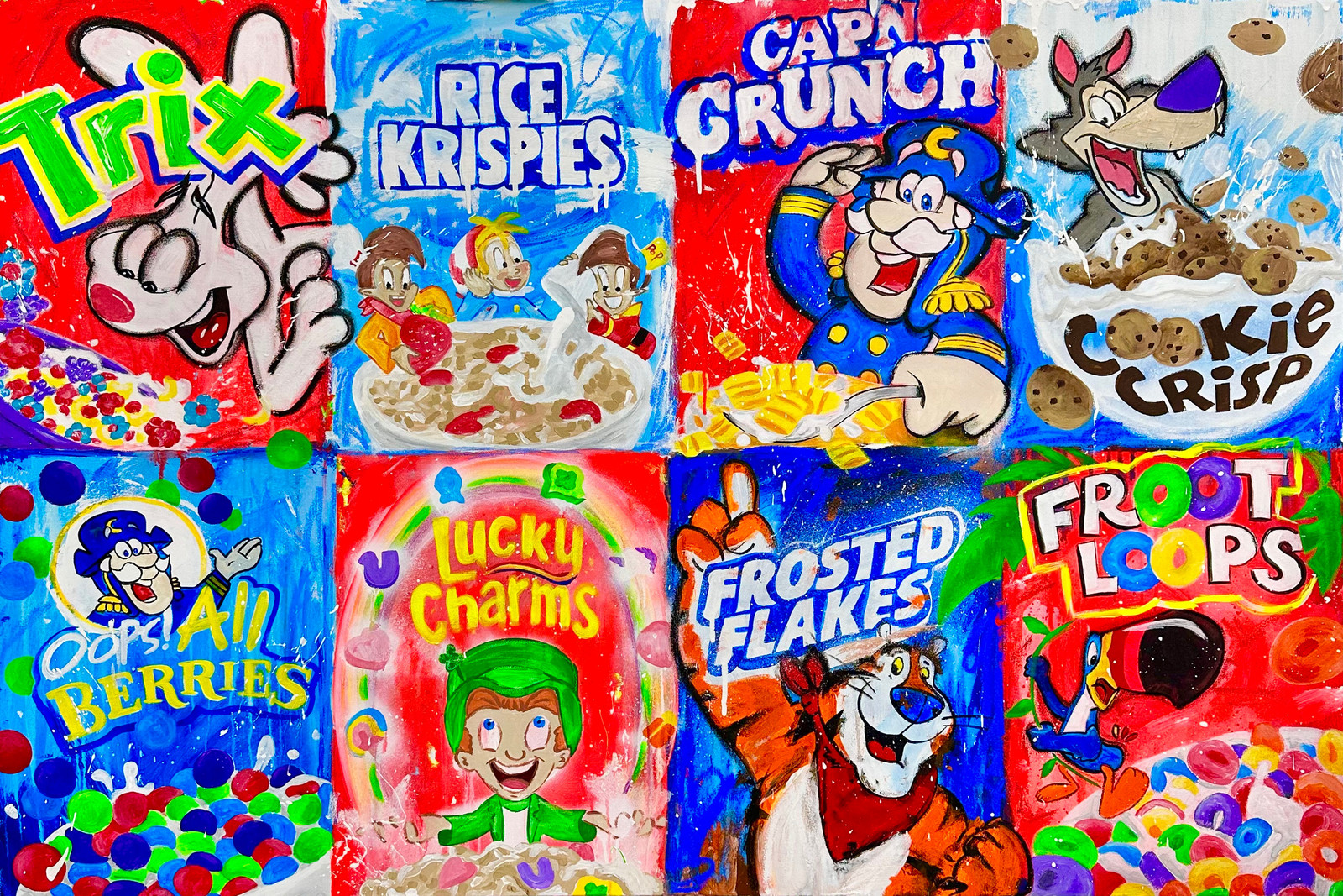 *Eight Cereals* (2025) is a acrylic and oil stick on canvas by Jojo Anavim, measuring 40 x 60 x 1 1/2 in 101.6 x 152.4 x 3.8 cm. This work is part of Anavim's painting practice — large-scale acrylic works that fuse the visual vocabulary of street art, American consumer culture, and contemporary graphic design with the material presence and formal demands of serious painting. Anavim (Los Angeles) has established a distinctive collector following in New York and internationally for works that inhabit the productive space between fine art and visual culture. Guy Hepner represents Jojo Anavim from our New York gallery. Contact us for pricing, availability, and condition reports.