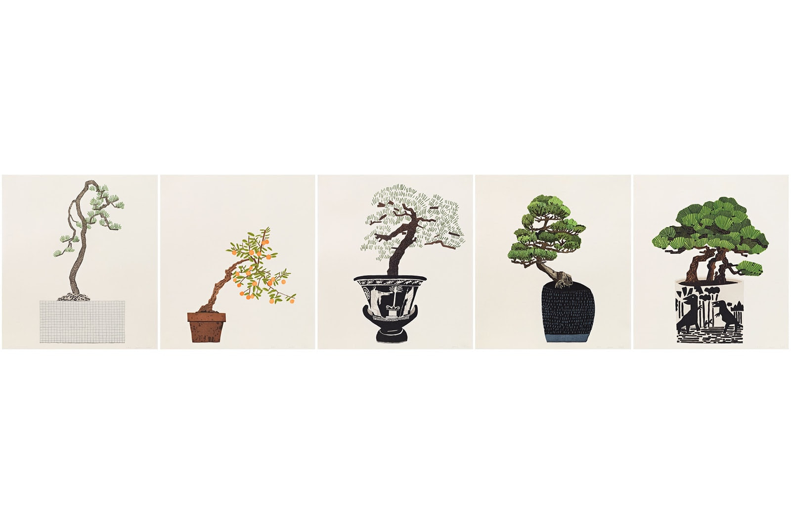 One of Jonas Wood's popular motifs is bonsai trees, which he explores through prints, paintings, and collages. His bonsai prints stand out for their vivid, graphic quality, blending elements of abstraction with realism. Wood's bonsai trees are not traditional, delicate representations; instead, they are bold and dynamic, featuring flattened perspectives and exaggerated proportions.These prints often show bonsai trees in brightly colored pots, set against rich, patterned backdrops. The interplay of geometric shapes and organic forms creates a striking visual contrast, emphasizing Wood's unique aesthetic approach. His use of color is playful and bold, with greens, blues, and pinks often dominating the compositions. This stylized representation of bonsai trees gives the works a surreal, almost dreamlike quality, while maintaining the recognizable features of the bonsai tradition.Wood’s bonsai prints can be seen as an exploration of domestic space and nature, capturing the serene beauty of these miniature trees while reinterpreting them through a contemporary lens. His work offers a fresh, modern take on a classical subject, appealing to both art collectors and plant enthusiasts.