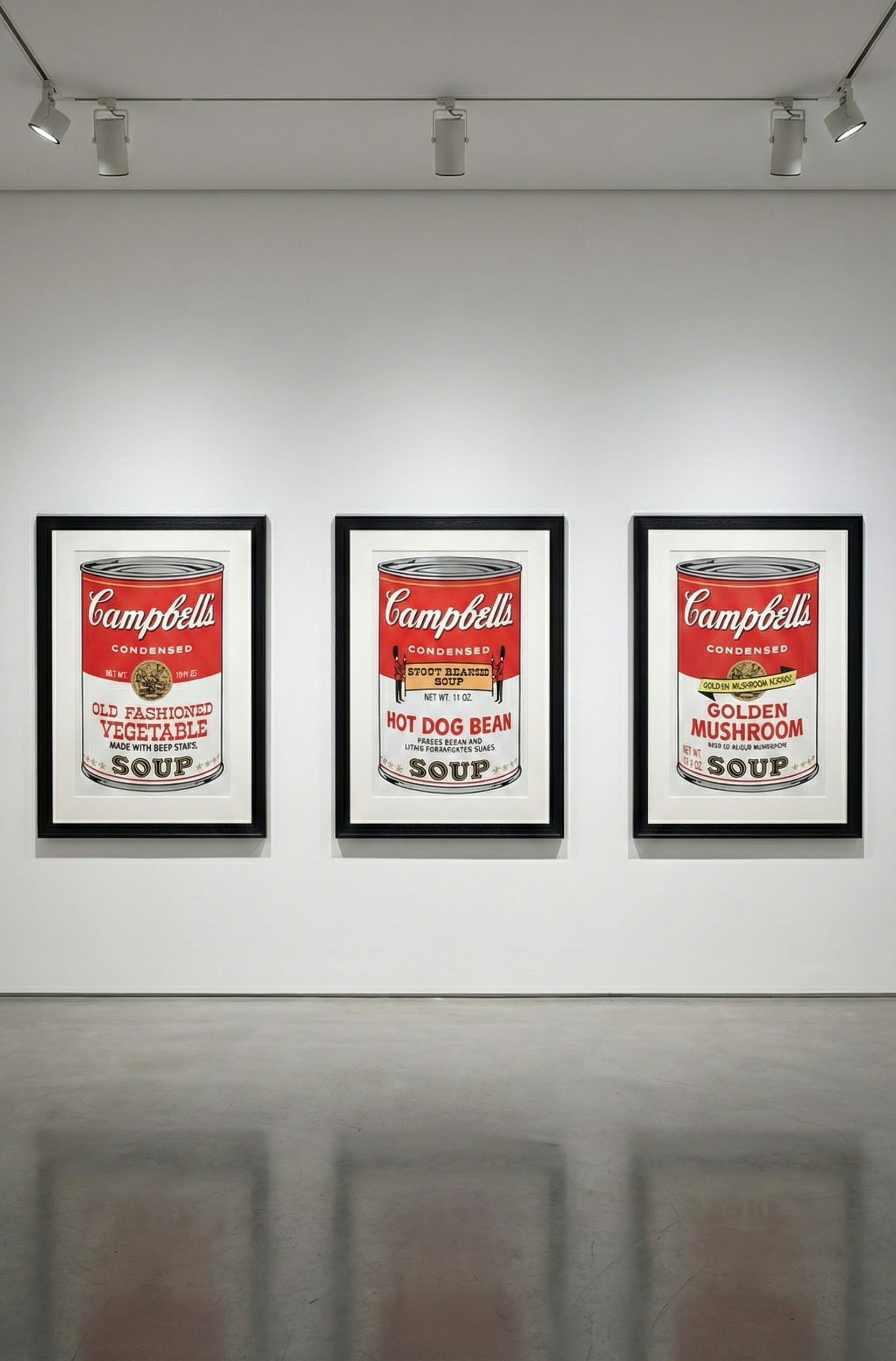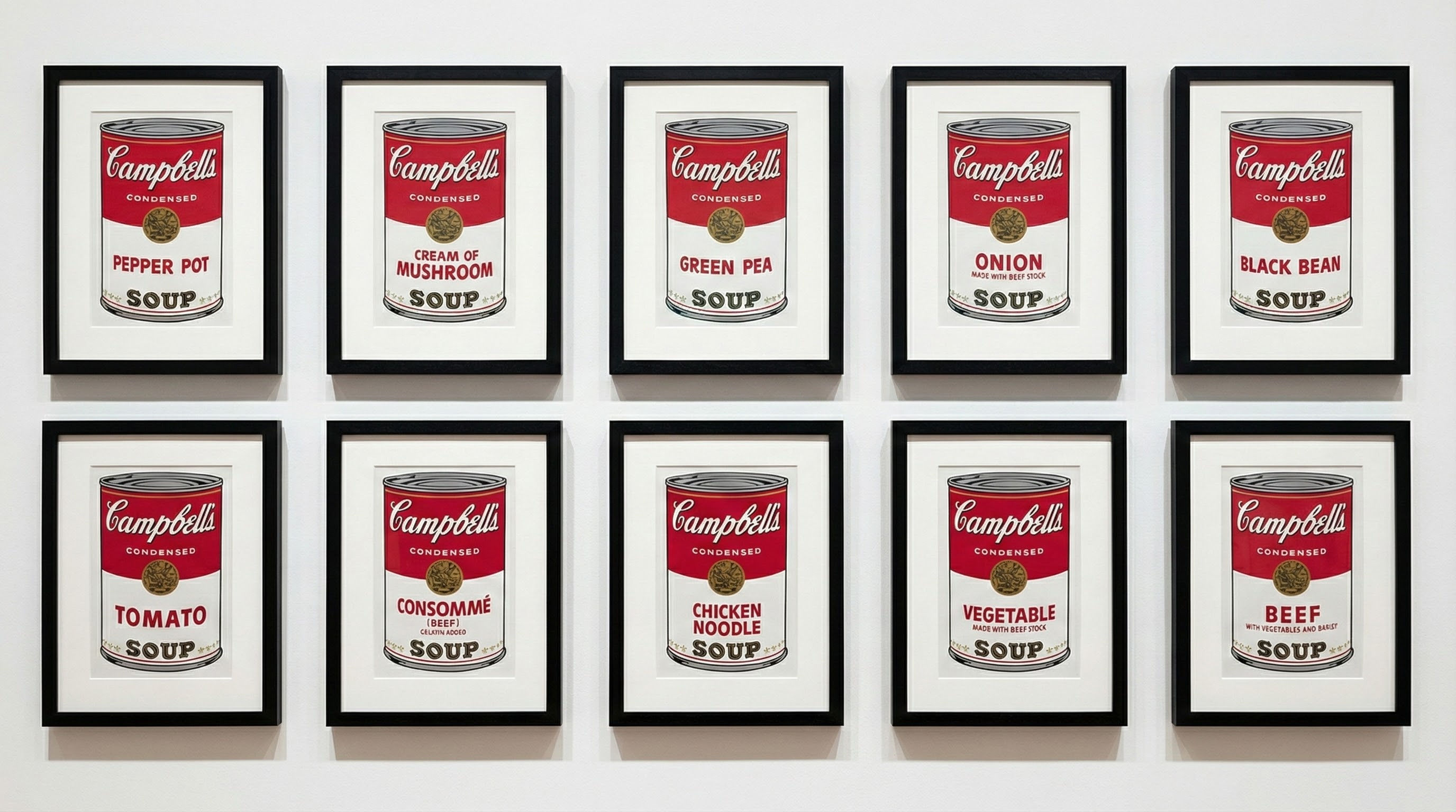 When Andy Warhol unveiled his Campbell’s Soup Cans in 1962, the art world did not know what had hit it. The debut of thirty-two hand-painted canvases, each depicting a different variety of Campbell’s soup, lined up side by side like a grocery store shelf, was an aesthetic shockwave. The arrangement was uniform, the colours crisp and clean, the imagery instantly recognizable to every American who had ever opened a kitchen cupboard. Yet it was presented not in a supermarket aisle, but in the sanctified, white-walled space of a New York gallery.
