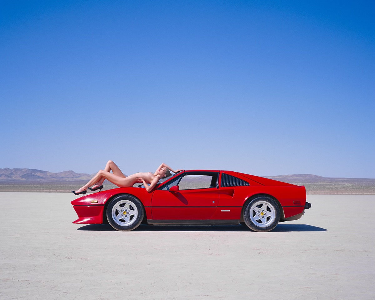 From his Indulgence series, Ferrari Sunbathe, captured moments before the car was set on fire, captures a leisurely let provacative moment. The striking contrast between the sleek curves of the car and the model's graceful form creates a scene of surreal elegance, while the fiery hue of the Ferrari adds a bold splash of color to the calming desert landscape.