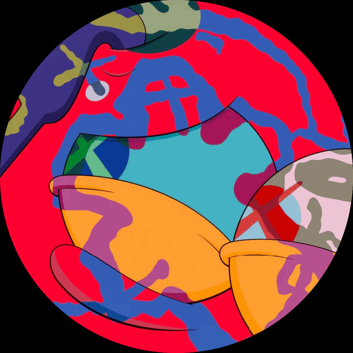 The prints are similar to KAWS' other series, including Tension, but are distinguished by their circular form. The prints appear to show close-ups of KAWS' cartoon characters, which are hard to discern under an overlayed medley of shapes and acidic colors. The prints feature Spongebob-inspired attributes and "XX" letterforms in vivid tones.
