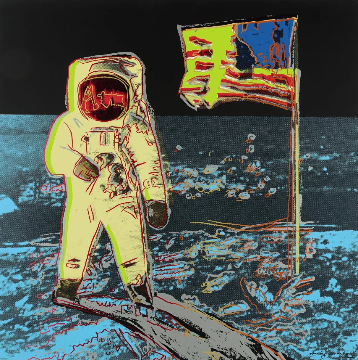 ANDY WARHOL'S MOONWALK SUITE, CREATED AS PART OF HIS EXPLORATION INTO SIGNIFICANT AMERICAN MOMENTS, CAPTURES THE MONUMENTAL 1969 MOON LANDING. THIS EVENT, FEATURING BUZZ ALDRIN AS PHOTOGRAPHED BY NEIL ARMSTRONG DURING THE APOLLO 11 MISSION, NOT ONLY STANDS AS A TECHNICAL AND EXPLORATORY ACHIEVEMENT BUT ALSO AS A PROFOUND CULTURAL AND HISTORICAL MILESTONE. WARHOL'S TREATMENT OF THIS ICONIC MOMENT IN MOONWALK, COMPLETED IN THE 1980S, IS A TESTAMENT TO HIS CONTINUED EVOLUTION AS AN ARTIST DEEPLY ENGAGED WITH THE THEMES OF CELEBRITY, HISTORY, AND AMERICAN IDENTITY.