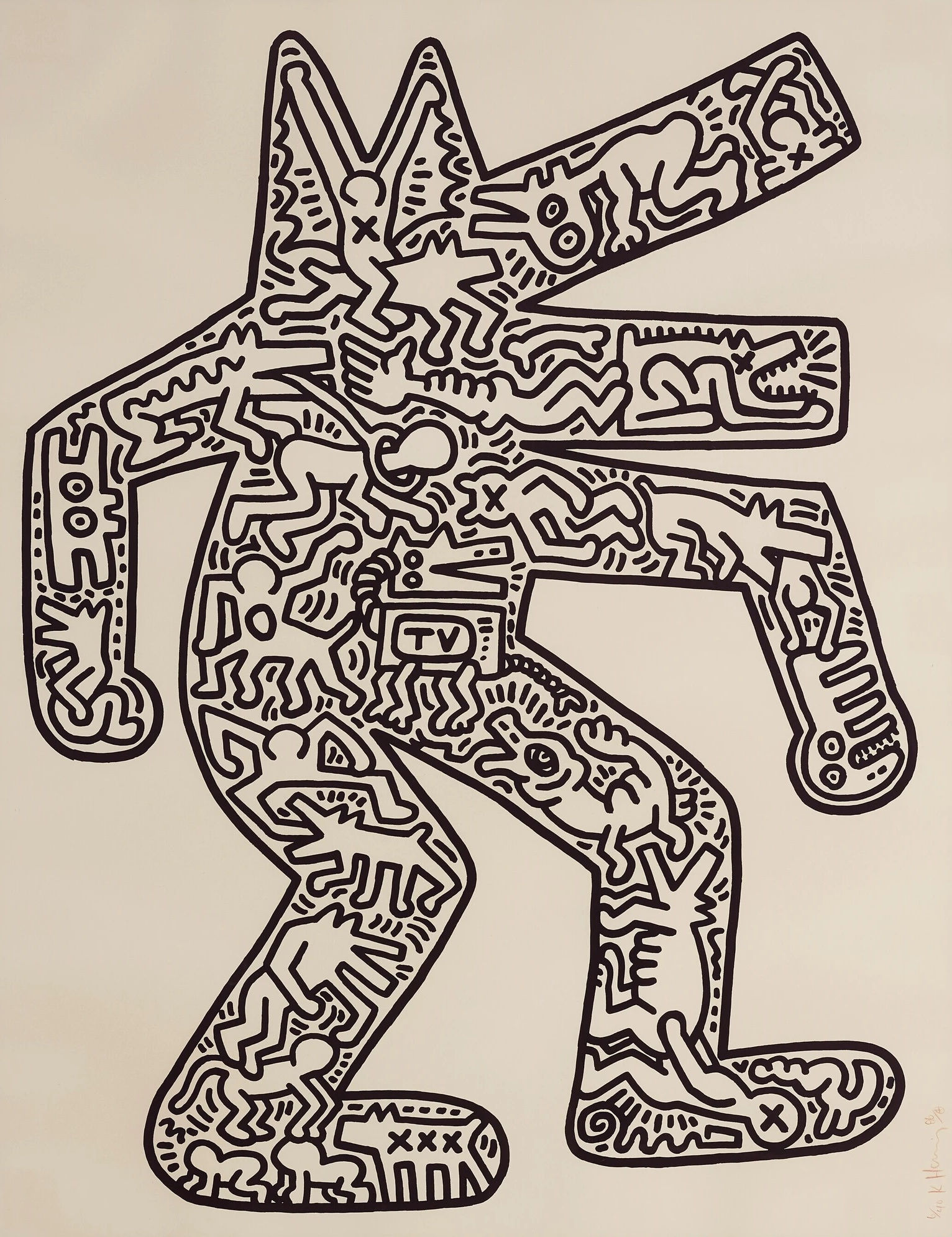 Encompassed within the shape of Haring’s human-like standing dog figure is a chaotic scene of stick figures, televisions, dogs, humanoids and deformed animals, providing the viewer with a glimpse of Hell. The figures are shown devouring and clambering on top of one another, with a devil-like figure spreading its wings at the top of the image. This dizzying frenzy of pictograms speaks to Haring’s feelings surrounding the socio-political events that characterised 1980s New York like the HIV/AIDS epidemic, the Cold War and crack epidemic.