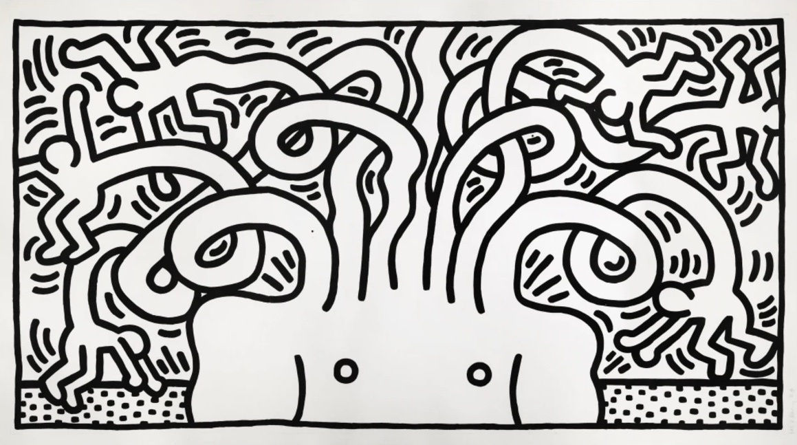 Keith Haring's Untitled (Medusa) is a striking work that exemplifies his unique ability to fuse classical mythology with contemporary social commentary. In this piece, Haring reinterprets the myth of Medusa, traditionally depicted as a monstrous figure with snakes for hair whose gaze could turn people to stone. Haring's rendition of Medusa retains this iconic imagery but infuses it with his distinctive style characterized by bold lines, vibrant colors, and dynamic figures.