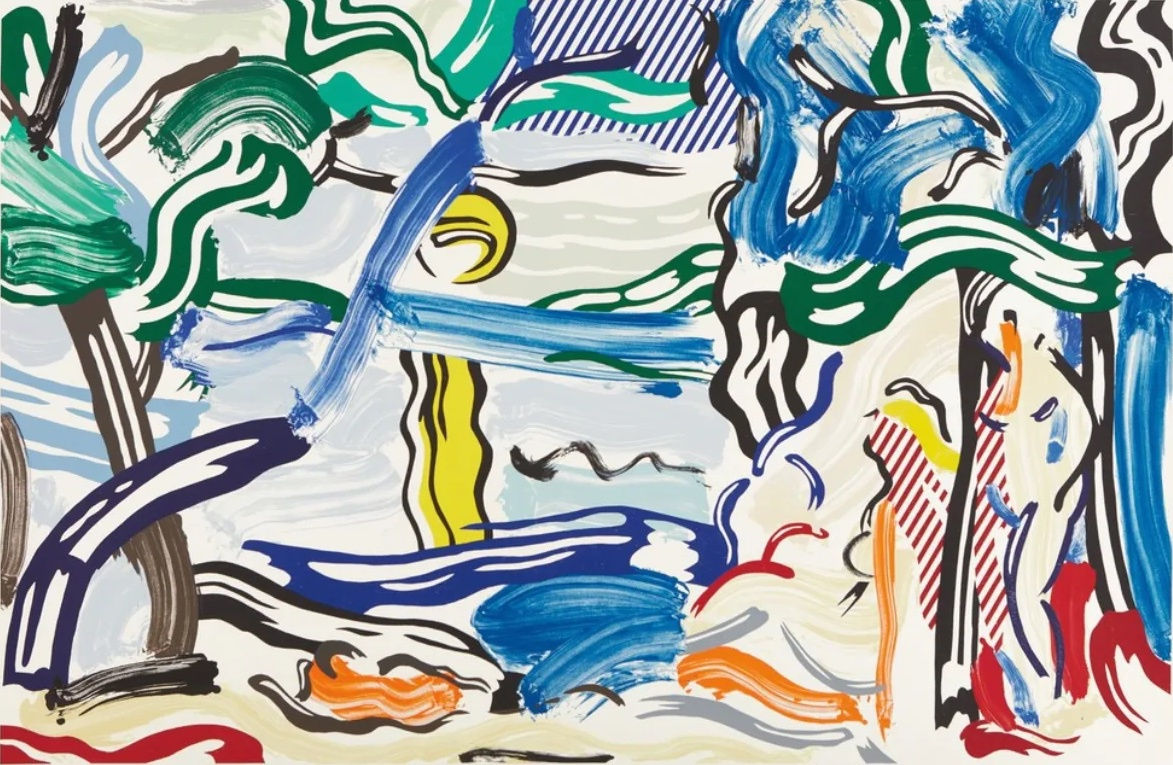 The work features flat planes of color, thick outlines, and uniform dot patterns, creating a sense of artificiality and abstraction. Trees, the road, and other elements of the forest are depicted with the same meticulous attention to detail and graphic precision found in LICHTENSTEIN’S comic book compositions. This approach challenges conventional notions of the picturesque and the sublime in landscape art, offering a modern, mechanical reinterpretation of the natural world.