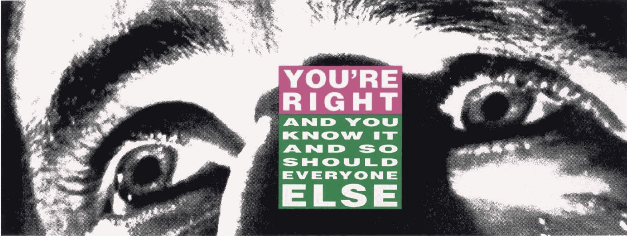 Kruger's early career in graphic design and editorial work profoundly influenced her artistic style. She is best known for her black-and-white photographs overlaid with bold, declarative text in white-on-red Futura Bold Oblique or Helvetica Ultra Condensed typeface. This distinctive aesthetic draws directly from the visual language of advertising and mass media, which Kruger repurposes to critique the very structures from which they originate. Her work often features pronouns such as "I," "You," and "We," creating a direct and personal engagement with the viewer.