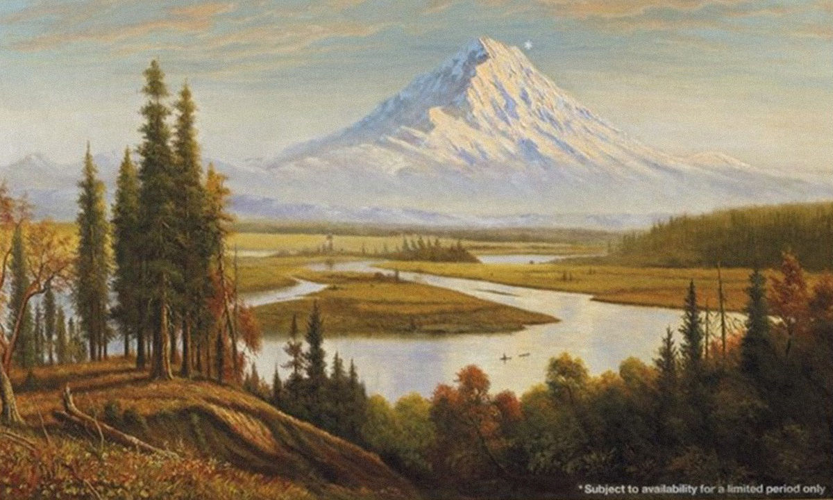 "Subject to Availability" is a notable piece within Banksy's series of altered oil paintings, characterized by its satirical depth and timely message. This work involves an intervention on an 1890 painting of Mount Rainier in Seattle by Albert Bierstadt, a key figure of the Hudson River School known for his critiques against the industrial revolution's environmental impact. BANKSY modernizes this political narrative by placing an asterisk next to the depicted dormant volcano, accompanied by the foreboding caption ‘*subject to availability for a limited period only’.