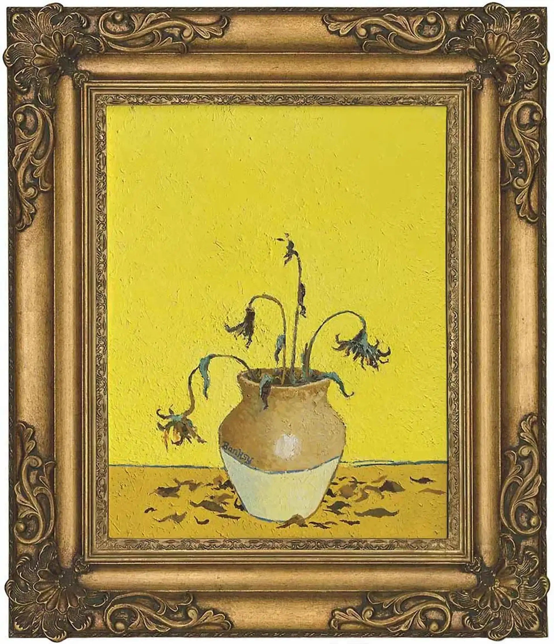 The piece engages directly with one of the most celebrated motifs in art history—Van Gogh's Sunflowers, originals of which are housed in prestigious museums across London, Philadelphia, Munich, Amsterdam, and Tokyo. Banksy's rendition is a commentary on institutional elitism and the dangers of excessive veneration. Moreover, it delves into environmental degradation, a recurrent theme in his work. Contrasting with Van Gogh’s vibrant sunflowers, BANKSY presents a bleak, dystopian scenario where the only sunflowers available are wilted relics from a petrol station, hinting at a future where natural beauty is commodified by the oil industry.