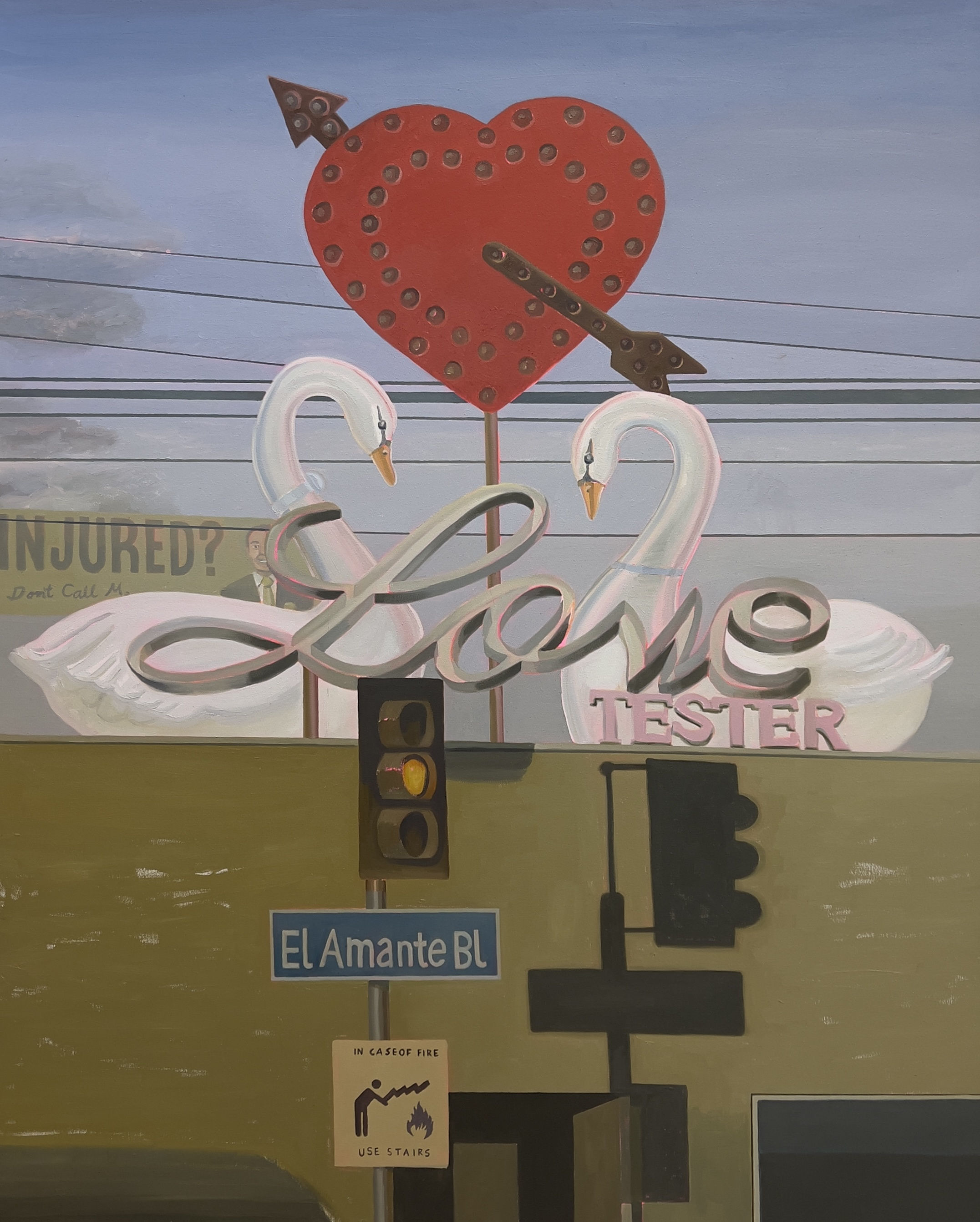 Love Tester 1 offers an exterior view of a place similar to the concept of a “bar” that we have now but is called love tester. This social place is located in a road filled with symbols and hints for the audience to understand the artist point of view.