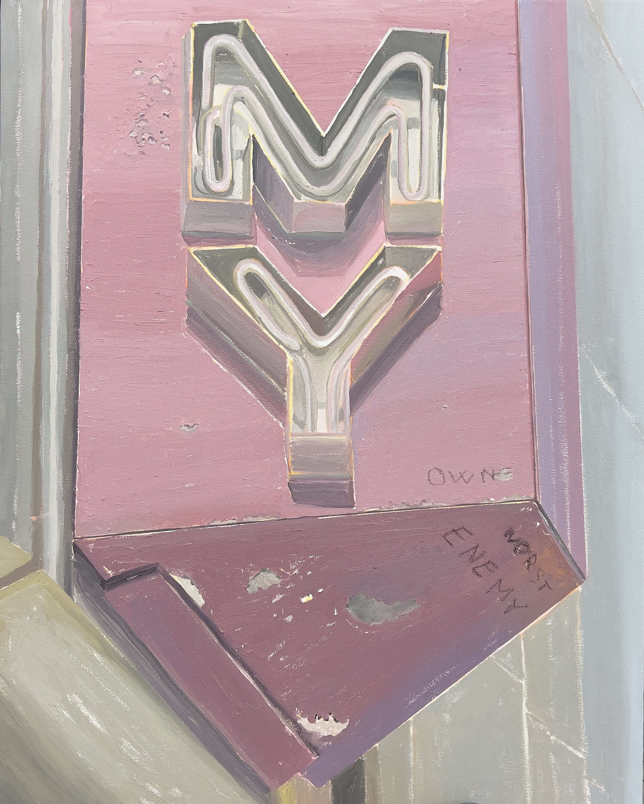My Own Worst Enemy features a neon sign from 14th Street, embodying the self-sabotage and internal conflicts that can arise in a relationship. This painting delves into the introspective phase of questioning one’s happiness and the personal battles that often accompany romantic entanglements.