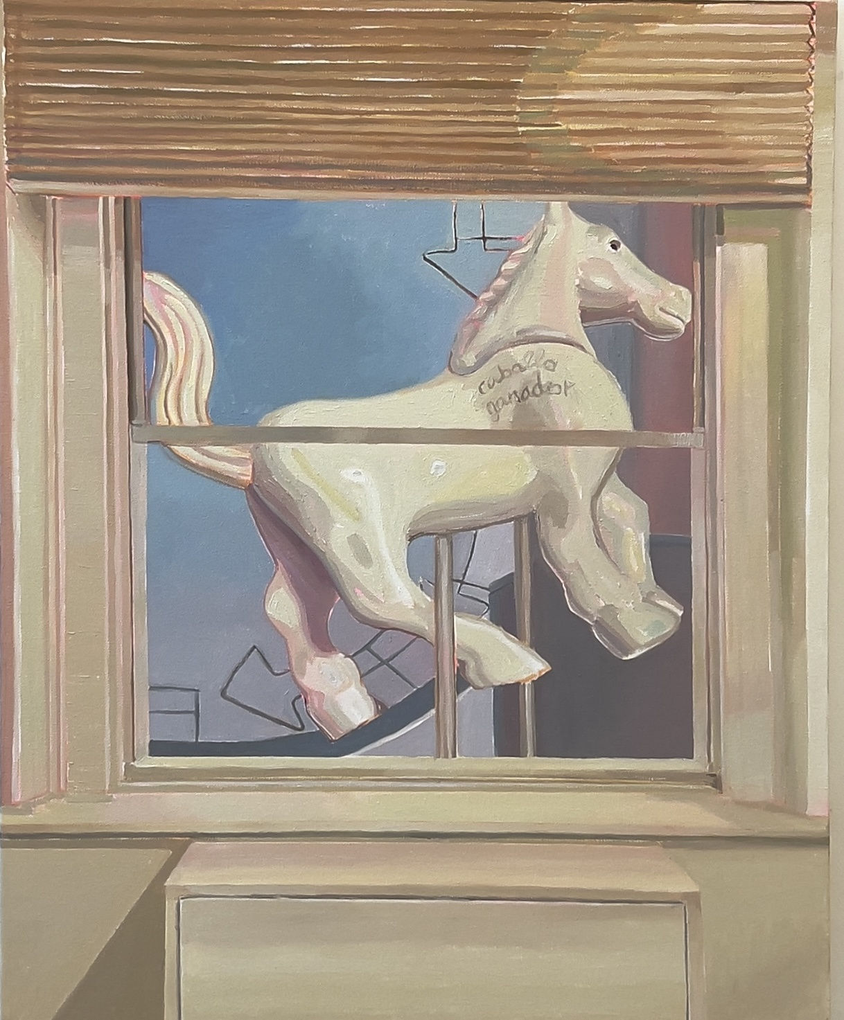 The sixth painting, “Winner Horse,” depicts a horse in motion, symbolizing victory and success. This piece represents a mental and emotional breakthrough, where leaving behind a difficult mindset / room allows for a renewed perspective. The horse’s historical association with triumph and achievement underscores the theme of overcoming obstacles and finding clarity.