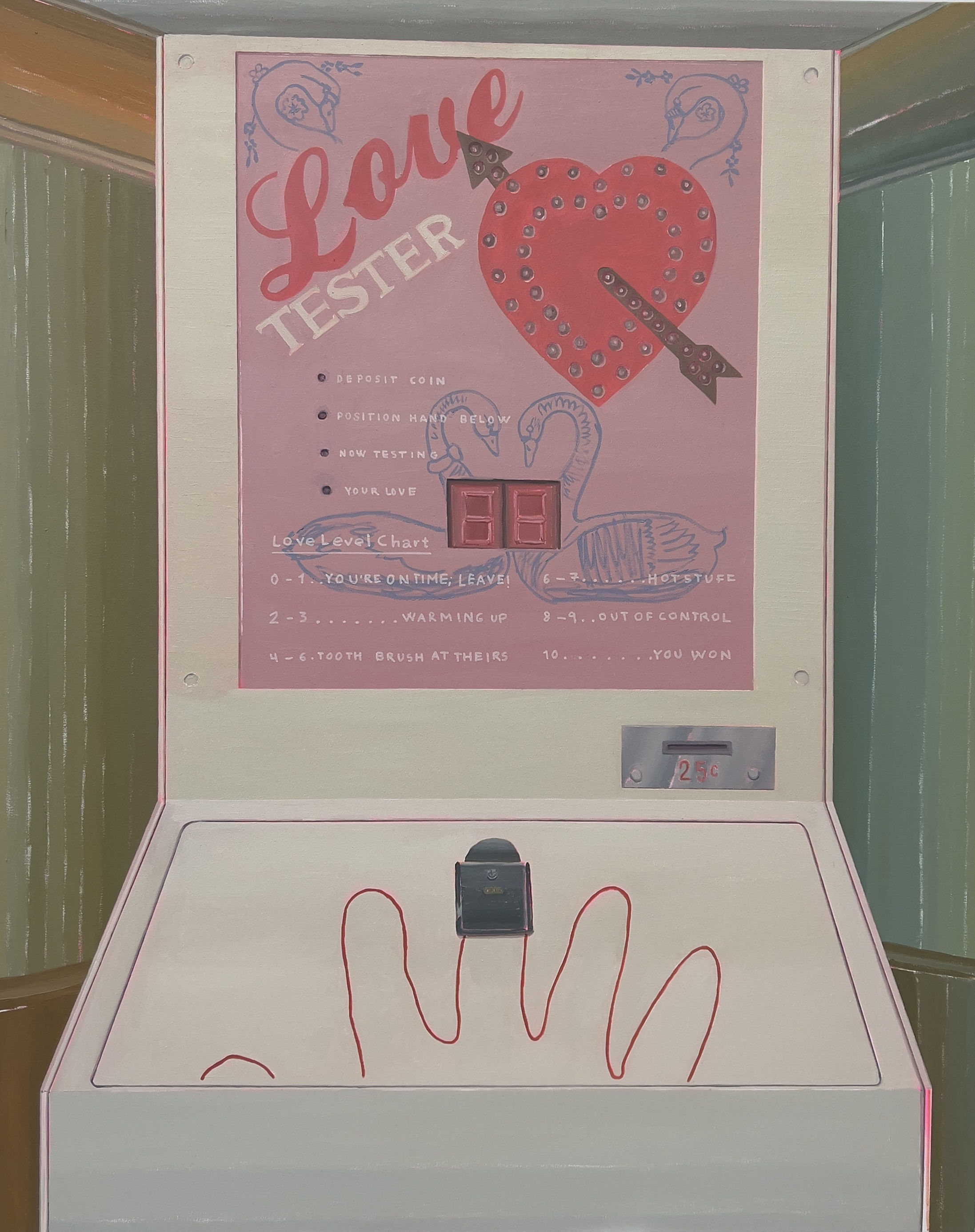 This painting zooms in on the machine’s intricate details. These pieces capture the stage of evaluating and balancing feelings in a relationship. The playful yet profound imagery of the love tester reflects the search for certainty amidst the complexities of love.
