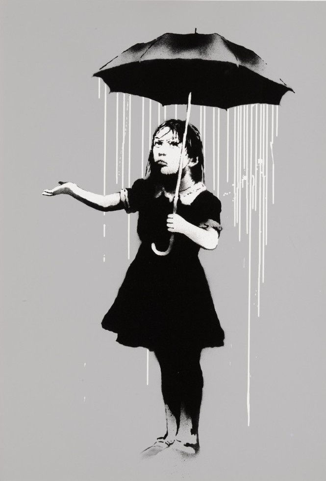 NOLA white rain, showcases Banksy's signature stencil work combined with a vivid use of symbolism. It depicts a young girl holding an umbrella, but instead of protecting her, the umbrella is the source of the rain pouring down on her. The rain that would typically fall from the sky is coming from the umbrella itself, hinting at a deeper theme of trust being misplaced or turned against oneself. Banksy's exploration of irony and emotional conflict in NOLA is widely interpreted as a critique of institutional safety measures that ultimately cause more harm than good. The simplicity of the image conveys a haunting message that lingers long after viewing.