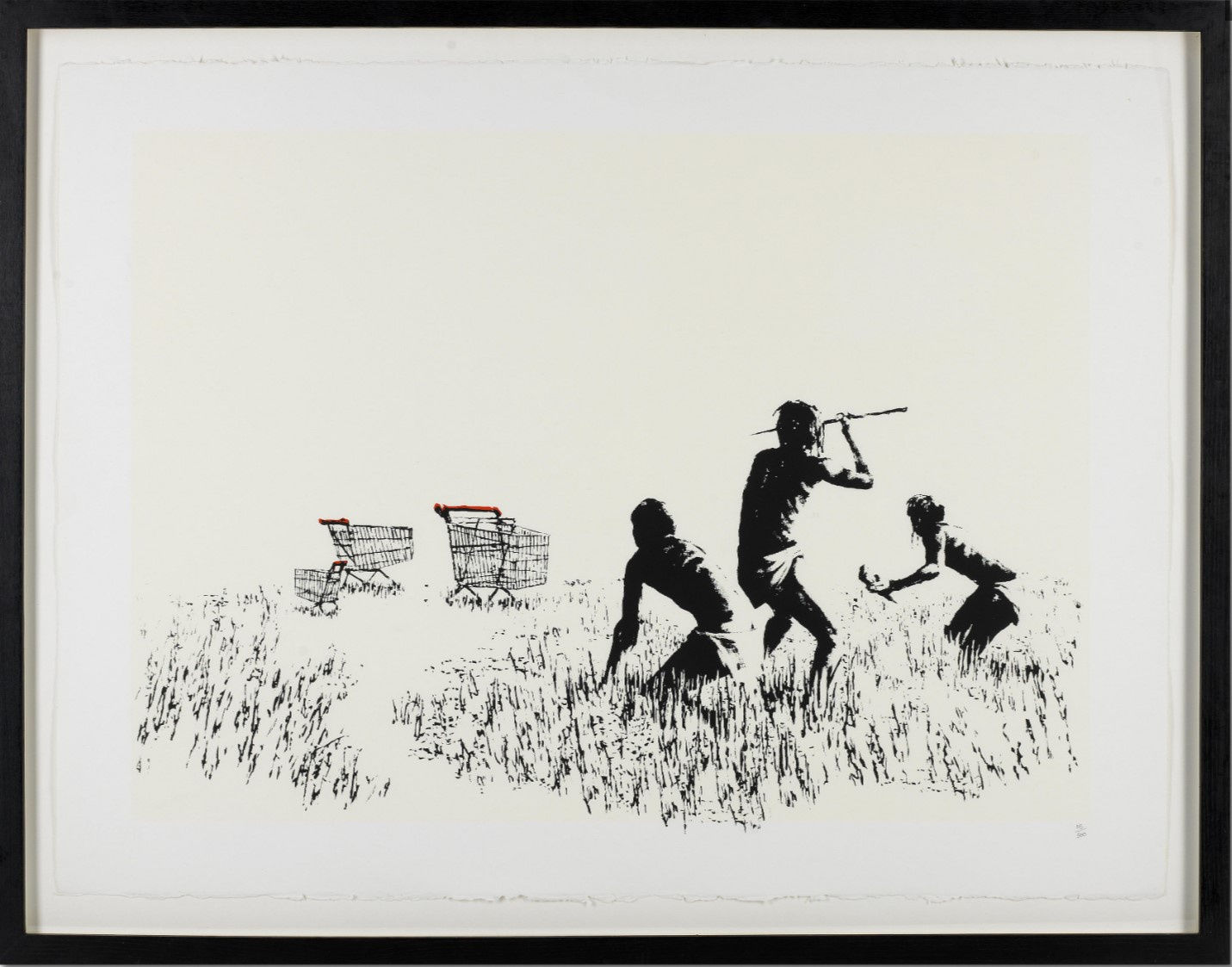 Trolley Hunters takes a darker, more satirical approach to contemporary consumerism. In this piece, Banksy portrays three primitive hunters holding spears, crouching in the grass, but instead of targeting wildlife, they appear to be hunting a group of shopping carts. Through this absurd imagery, Banksy mocks modern humanity’s obsessive relationship with consumer goods, calling into question the values of society. The juxtaposition of a primal survival instinct with a modern, unnecessary object is Banksy’s way of commenting on how far humanity has strayed from its original needs and desires, driven by consumerism rather than sustenance.