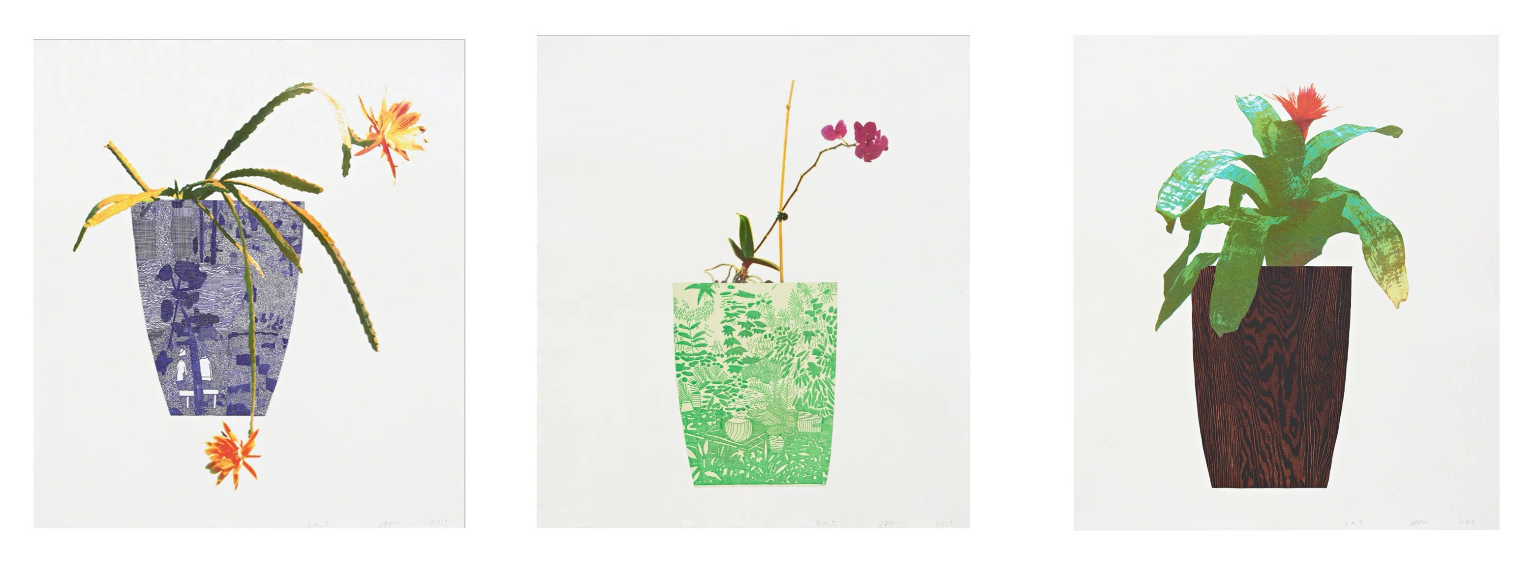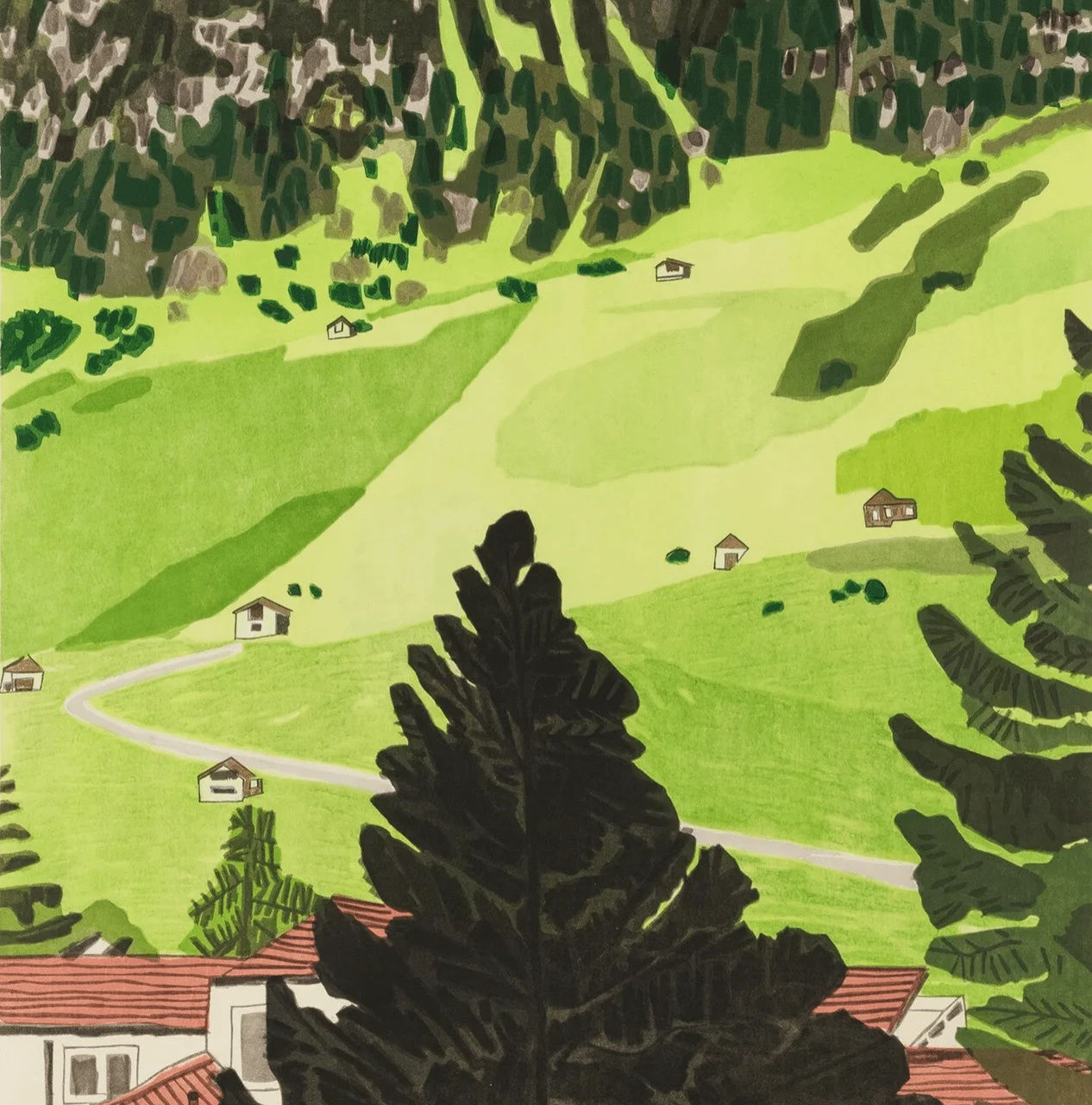 His process, involving both printmaking and painting, contributes to the distinct graphic quality of his work. Printmaking, particularly, allows him to experiment with repetition and variation, further refining his approach to line and pattern. Wood often revisits themes or subjects, as in his Landscape Pot series, allowing subtle variations to emerge through different applications of color and linework. This repetition creates a sense of continuity across his body of work, showing how minor shifts in texture or color can transform a familiar scene into something entirely new.