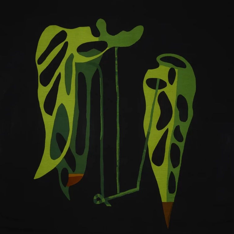 Wood's technique involves meticulous layering and an intricate play of lines and dots, which contribute to the visual complexity of his work. He approaches his paintings in stages, first creating a preparatory drawing before moving onto the painting itself, a method that gives his work its graphic, almost collage-like feel. For instance, in works like Clipping 2017, his stylization of plant leaves employs lines to construct intricate details, each segment almost forming a puzzle piece in the larger composition. This layered approach allows him to balance realism with abstraction, making each work feel at once familiar and novel.