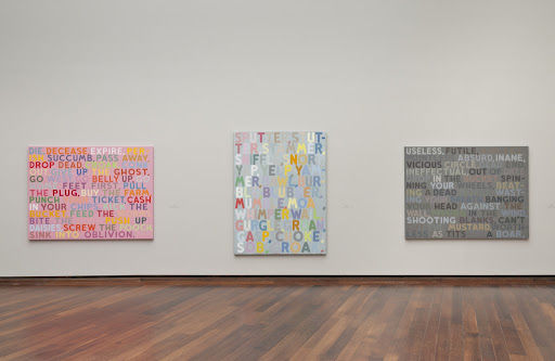 Bochner treats text not merely as content but as a formal/visual element. The layout, color, materiality, texture, scale, even the distortions (blurring, runny paint, varying letter color) all intervene in how we read meaning. At times the words are almost erased or obliterated so that legibility is partial, making the viewer struggle between reading and seeing. -