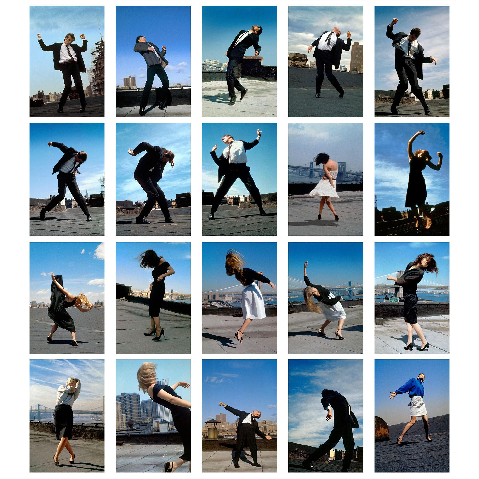 The resulting images - figures isolated against stark white backgrounds, frozen mid-motion - distill a single instant of psychological rupture. The anonymity of the subjects, combined with their formal suits and dresses, turns each into an archetype of late capitalist anxiety: the elegant professional under invisible pressure, suspended between power and collapse.