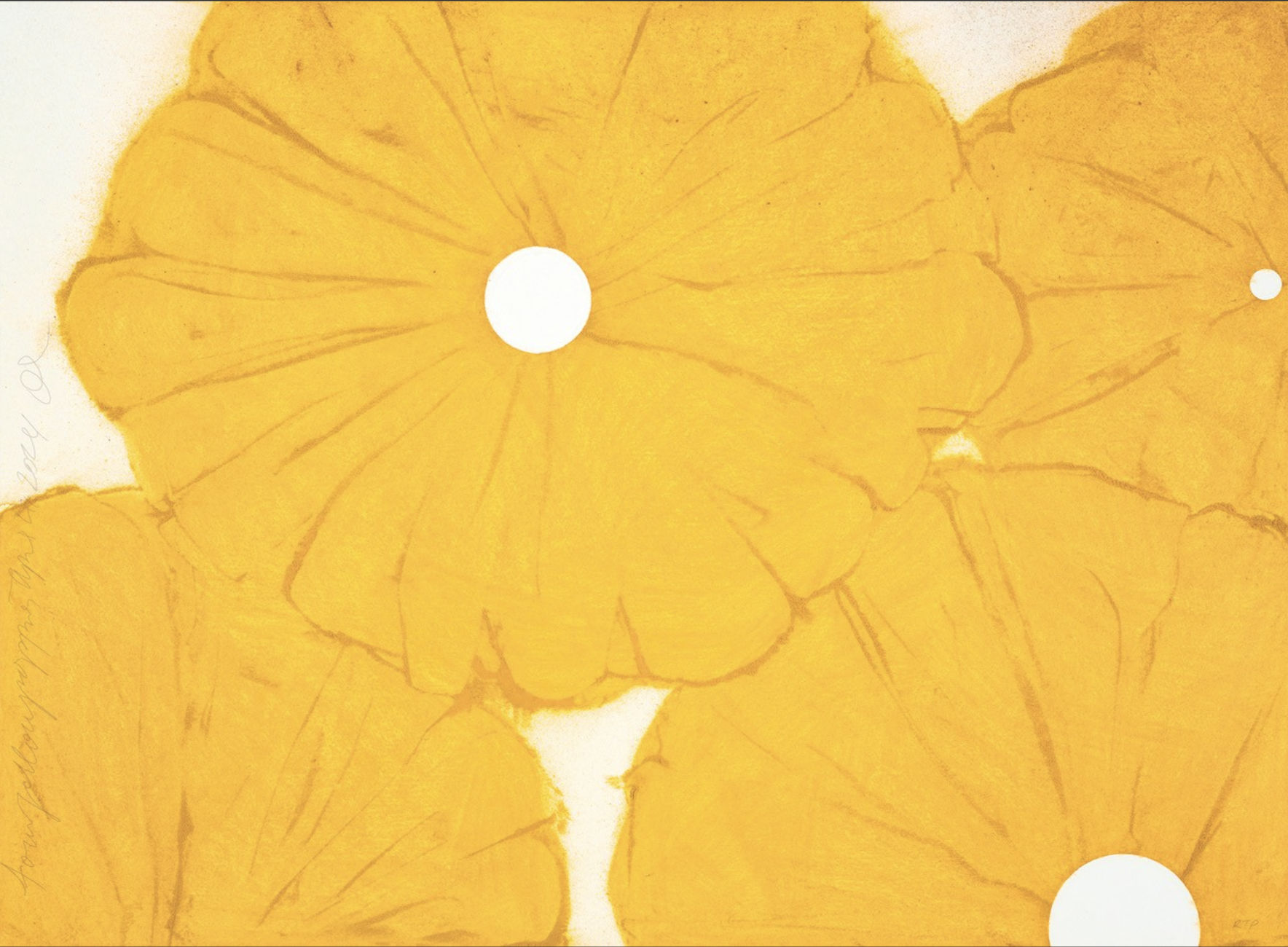 In works such as Poppies (2002) or Black Lemons (1986), Sultan employs deep black fields that swallow light like the early dusk of autumn. Against this darkness, the vivid oranges, reds, and yellows of his forms blaze with life. His choice of heavy paper, embossed surfaces, and dense inks gives the prints an almost tactile weight — they feel as though they’ve been forged rather than printed. This materiality mirrors the season of fall itself: a time when nature feels both full and fading, ripe and rotting, alive and on the edge of loss.
