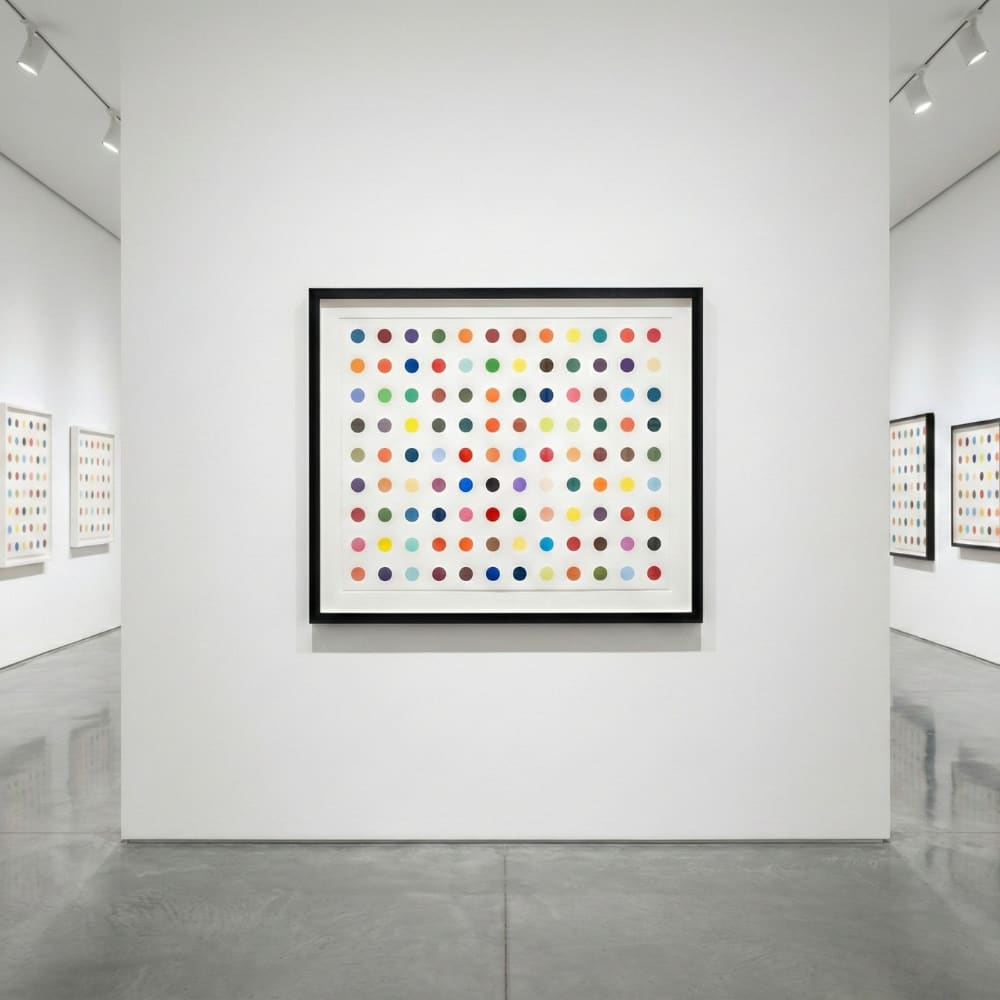 The Damien Hirst Spot series represents one of the most recognizable and philosophically complex bodies of work in contemporary art. These deceptively simple arrangements of colored circles, each bearing pharmaceutical drug names, transform the gallery into a meditation on life, death, and the promise of modern medicine. Since their inception in the late 1980s, the Damien Hirst Spot series has become synonymous with the artist's broader investigation into mortality and humanity's relationship with science.