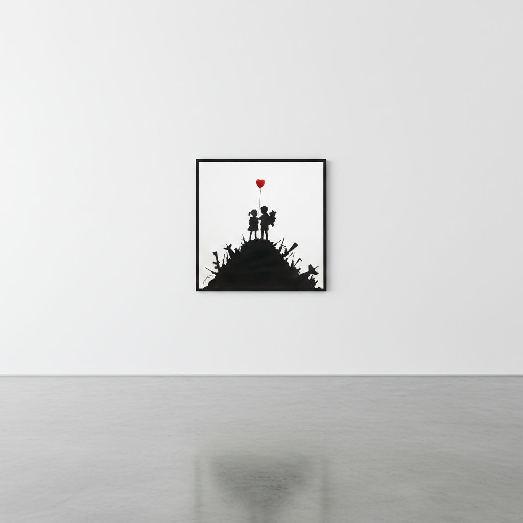In works depicting children with weapons, often referred to as Kids on Guns, Banksy heightens the tension between innocence and violence. By placing firearms in the hands of children, he forces an immediate moral reckoning. The images are unsettling precisely because they violate deeply held assumptions about childhood as a protected space. When hearts or symbols of affection appear in these contexts, they underscore the tragedy of lost innocence and the normalization of conflict. The message is not subtle: a society that allows violence to shape the world of children has already failed in its most basic responsibility.