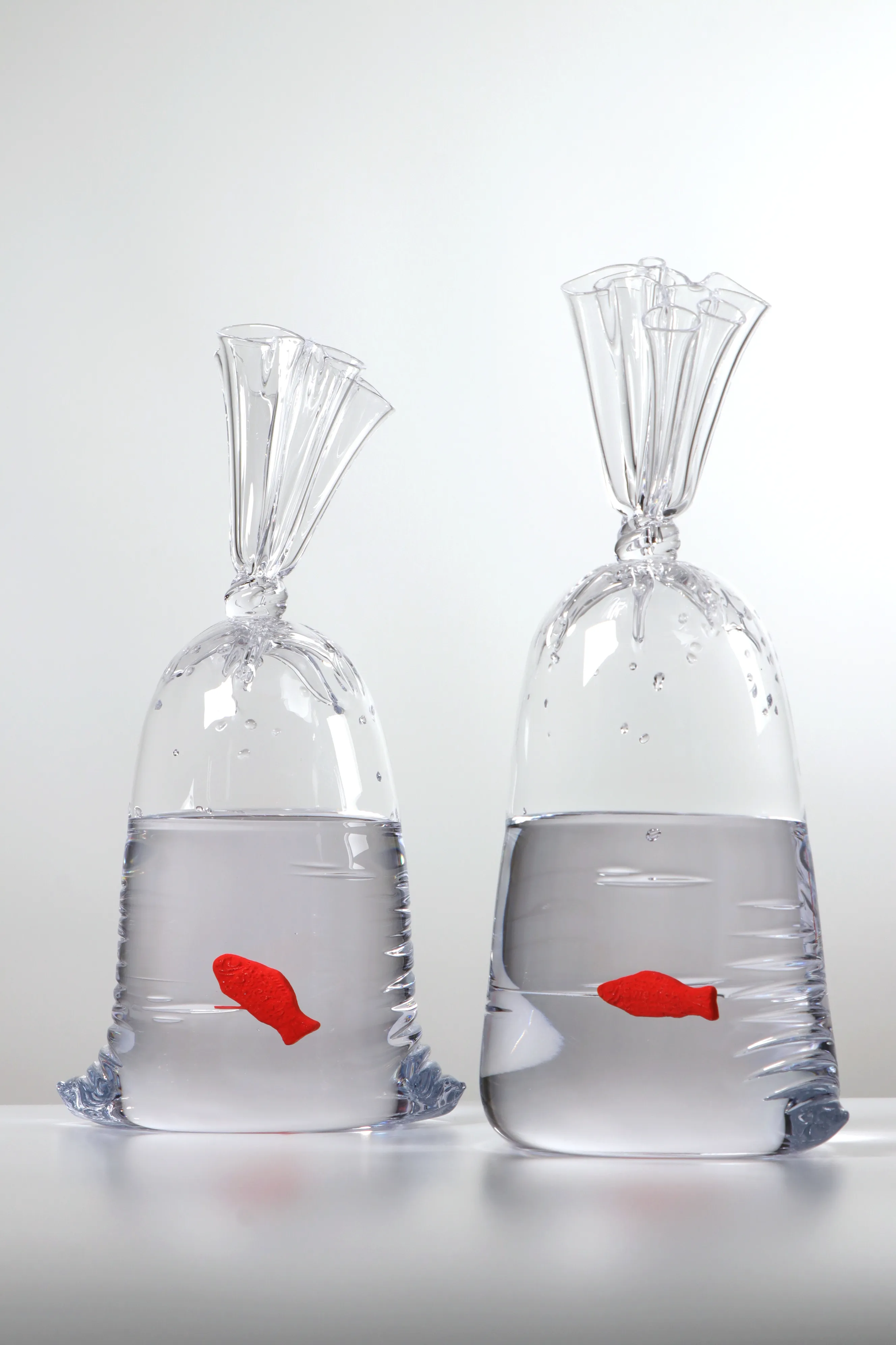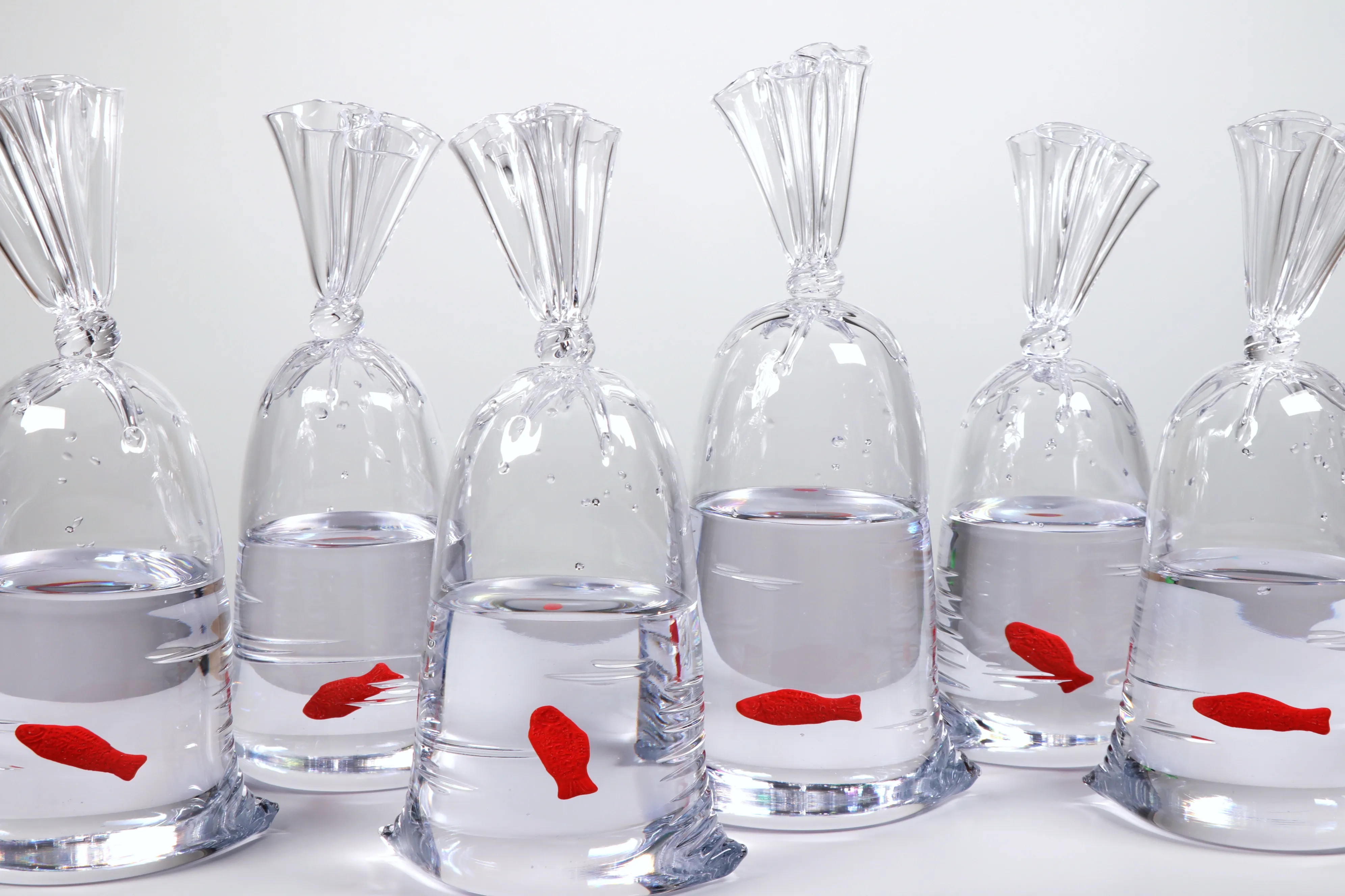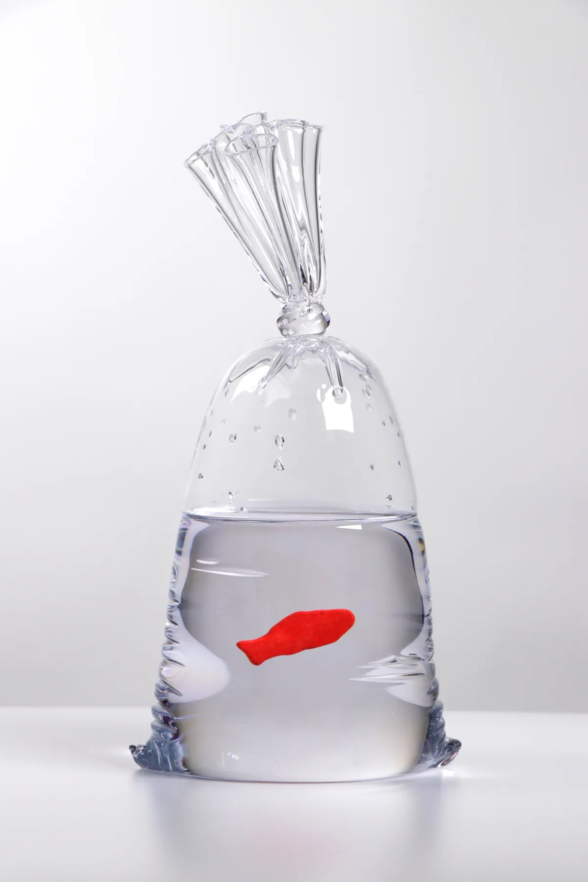 Contemporary artist Dylan Martinez continues to expand his celebrated Water Bag sculptures with the introduction of the Swedish Fish series, the newest edition within his ongoing body of handblown glass works. Known for transforming familiar, disposable objects into meticulously crafted sculptures, Martinez has built a distinctive practice centered on illusion, nostalgia, and the surprising potential of glass. With the release of Swedish Fish, the artist introduces a playful new visual element to the series, capturing one of the most recognizable candies of childhood suspended inside his signature glass water bags.