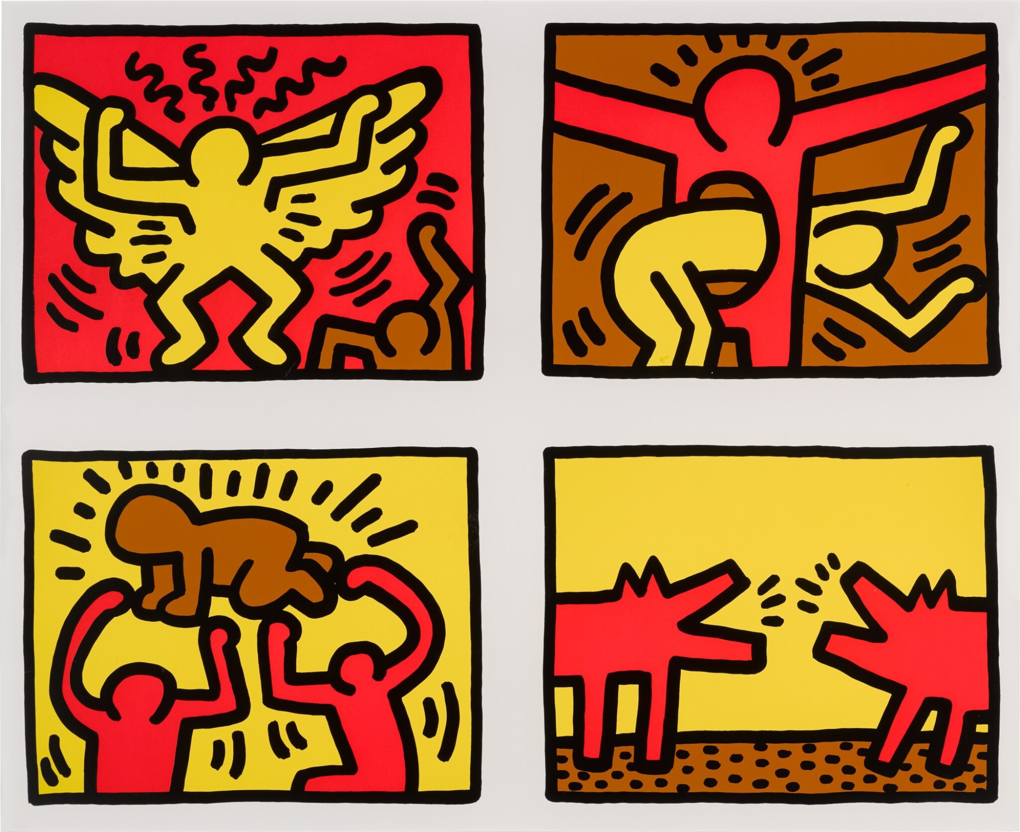 Keith Haring's Pop Shop I is part of a series of screenprints that embody his distinctive artistic style and his commitment to making art accessible to a wider audience. Created in 1987, the Pop Shop I suite features four panels, each filled with HARING'S iconic imagery and vibrant colors.