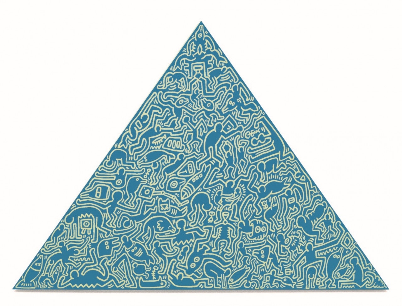 Though Haring is best known for his bold and lively prints, many of his works pay homage to ancient civilizations, their iconography, and their crafts. The motif of the pyramid in his work reflects his desire to emulate ancient visual symbols and create an iconography that is not only universally legible but also timeless. HARING'S pyramids invite viewers to reflect on the human condition, societal issues, and the importance of empathy and understanding.