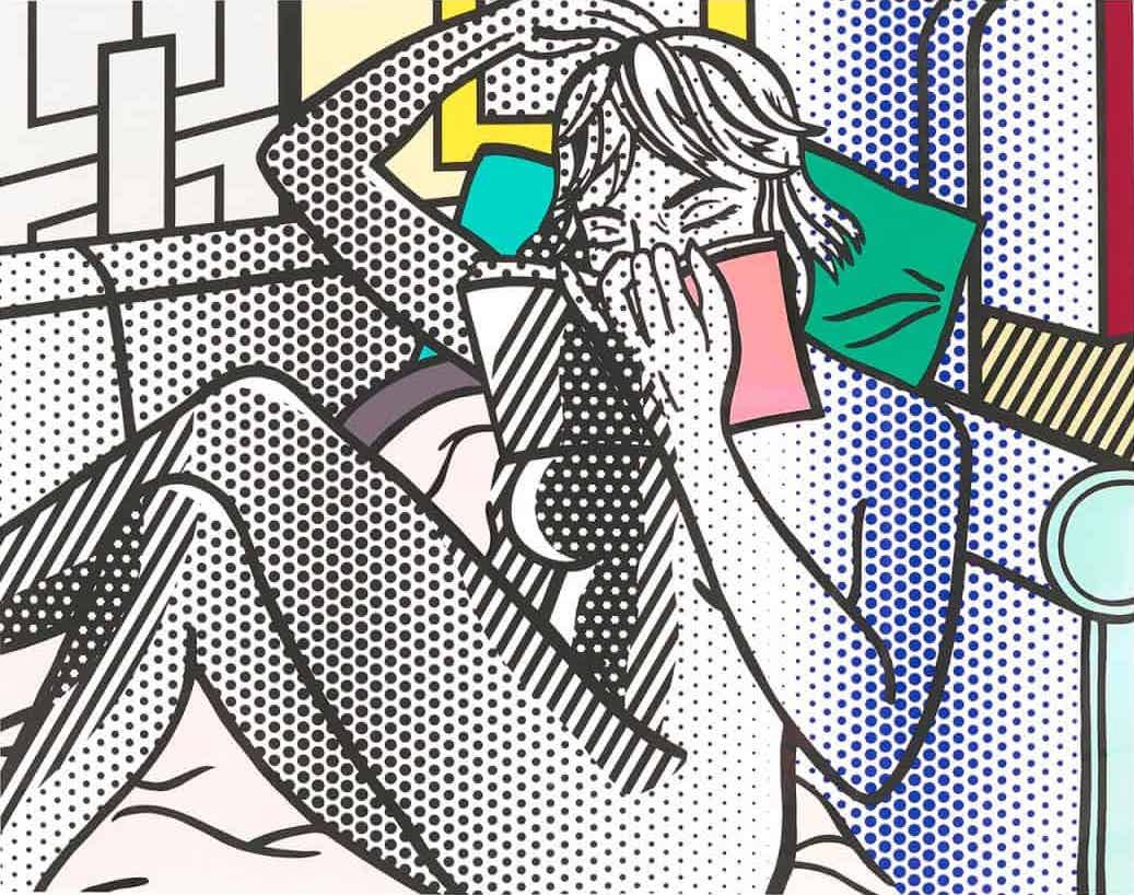 The composition of Roommates contrasts stark geometrical shapes with the curvilinear form of the portrayed female body. This juxtaposition highlights Lichtenstein’s mastery of his craft, demonstrating his ability to blend abstract and figurative elements seamlessly. The detailed use of Ben Day dots and vivid colors creates a dynamic and engaging visual experience.