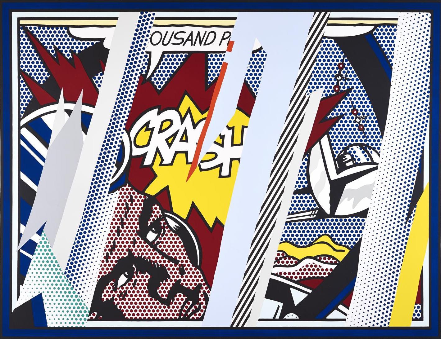 The Reflections series, including Reflections on Crash, revisits LICHTENSTEIN'S iconic motifs from his extensive body of work. In this piece, familiar elements such as his blonde heroine and explosive war scenes are partially obscured by streaks that mimic the effect of looking through a glass pane. This technique interrupts the narrative flow, requiring the viewer to piece together the fragmented images. By doing so, Lichtenstein engages the viewer in a deeper, more active form of visual interpretation.