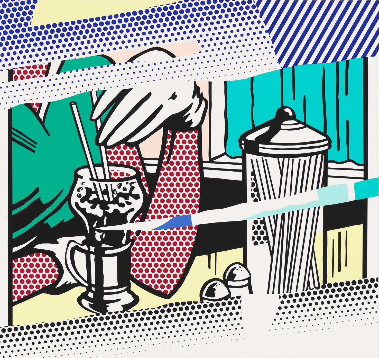 Reflections on Soda Fountain also reflects Lichtenstein's fascination with mass production and consumer culture. The use of Ben-Day dots and bold, graphic lines mimics the appearance of commercial printing techniques, reinforcing the connection between his art and the visual language of advertising and comics. This technique underscores the tension between originality and replication, a central theme in Lichtenstein's work.