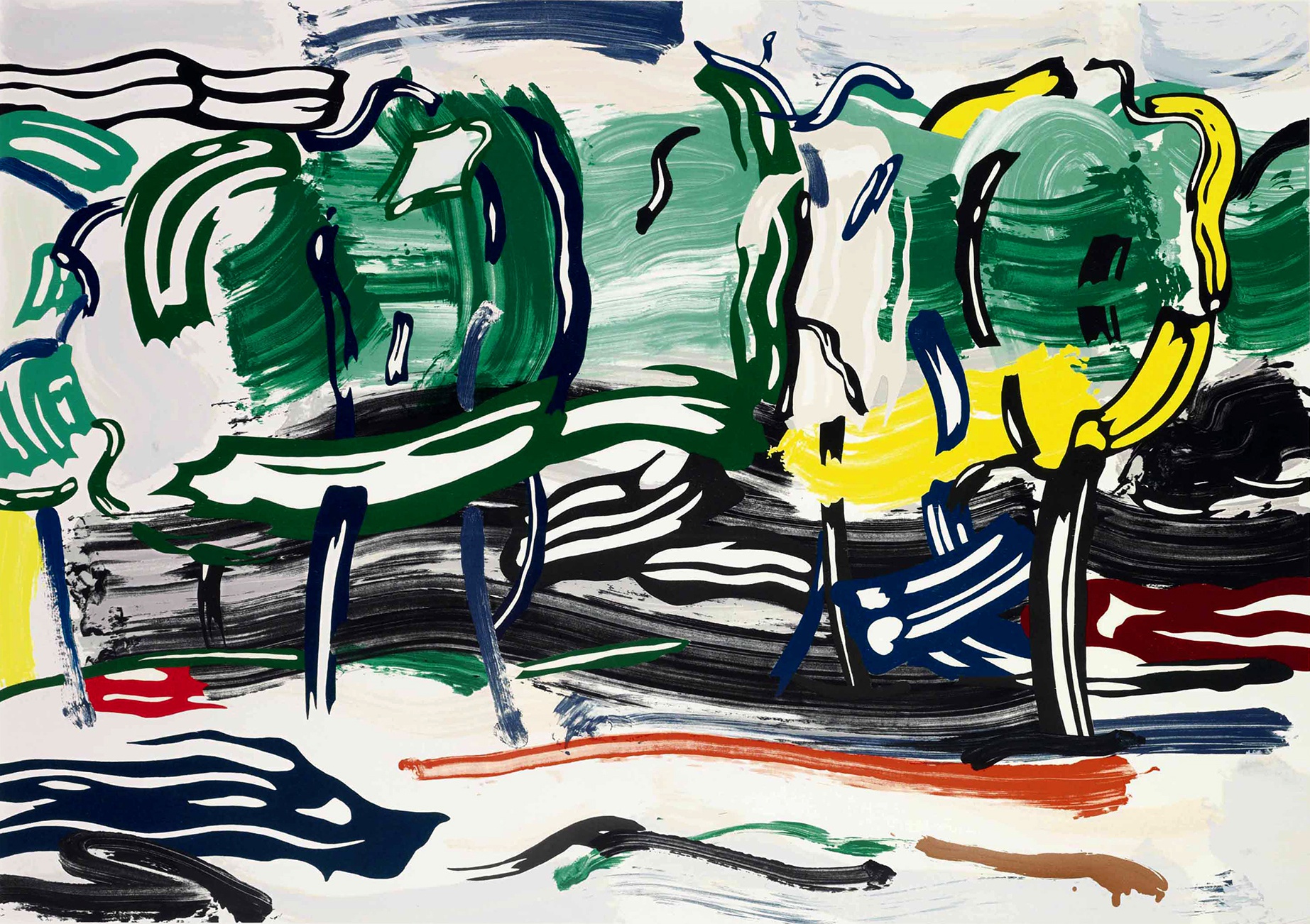 The work features flat planes of color, thick outlines, and uniform dot patterns, creating a sense of artificiality and abstraction. Trees, the road, and other elements of the forest are depicted with the same meticulous attention to detail and graphic precision found in LICHTENSTEIN’S comic book compositions. This approach challenges conventional notions of the picturesque and the sublime in landscape art, offering a modern, mechanical reinterpretation of the natural world.